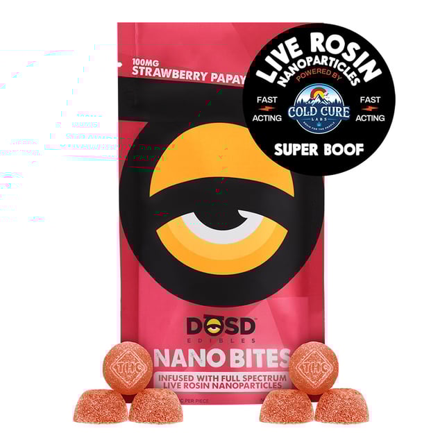 ROSIN Nano Bites - Award-winning Strawberry Papaya Flavored Gummies infused with strain-specific, Live Rosin Nanoparticles.